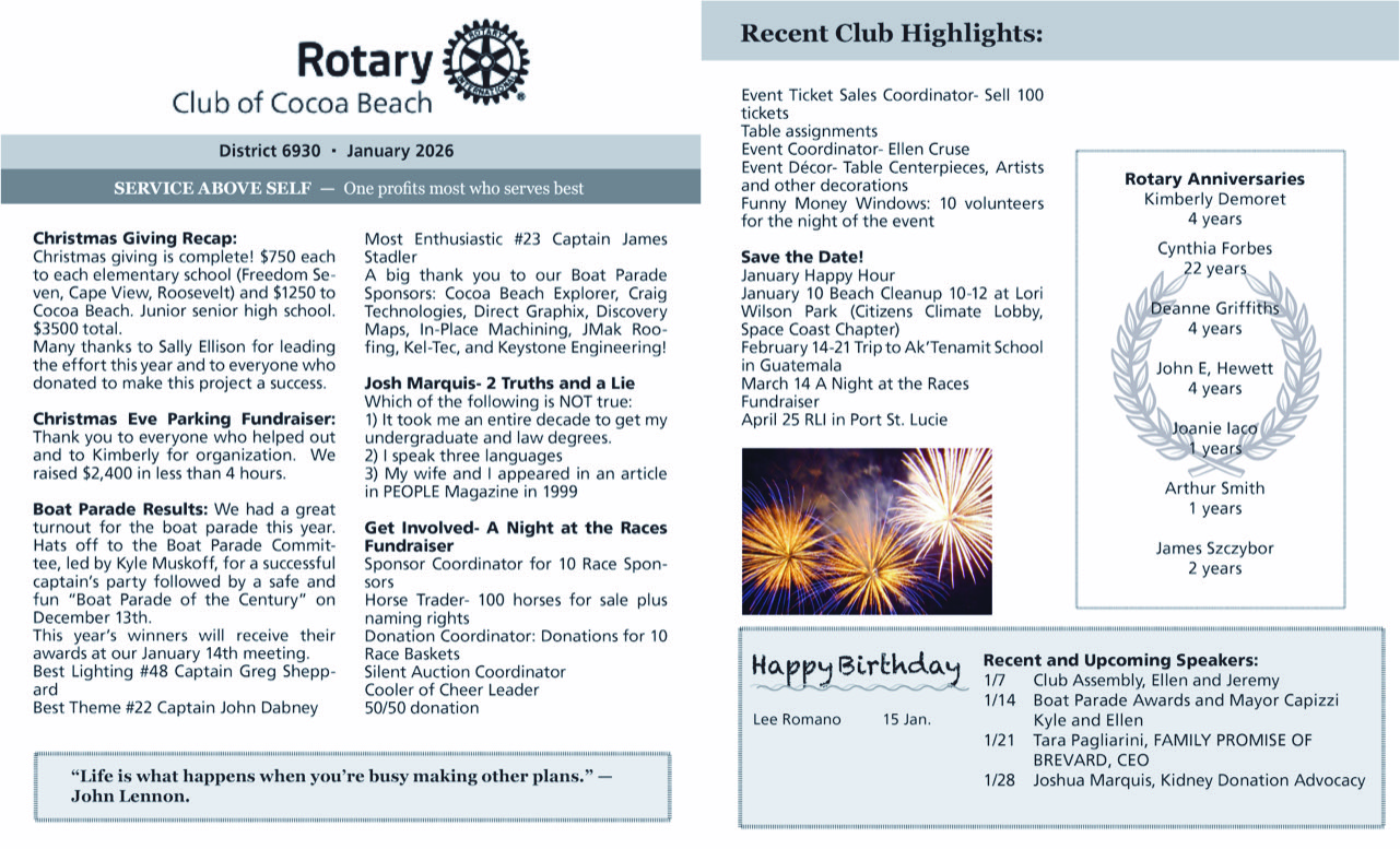 Weekly Rotary club programs keep members informed about what is taking place in the community, nation, and world. Rotarians are motivated to make a difference.